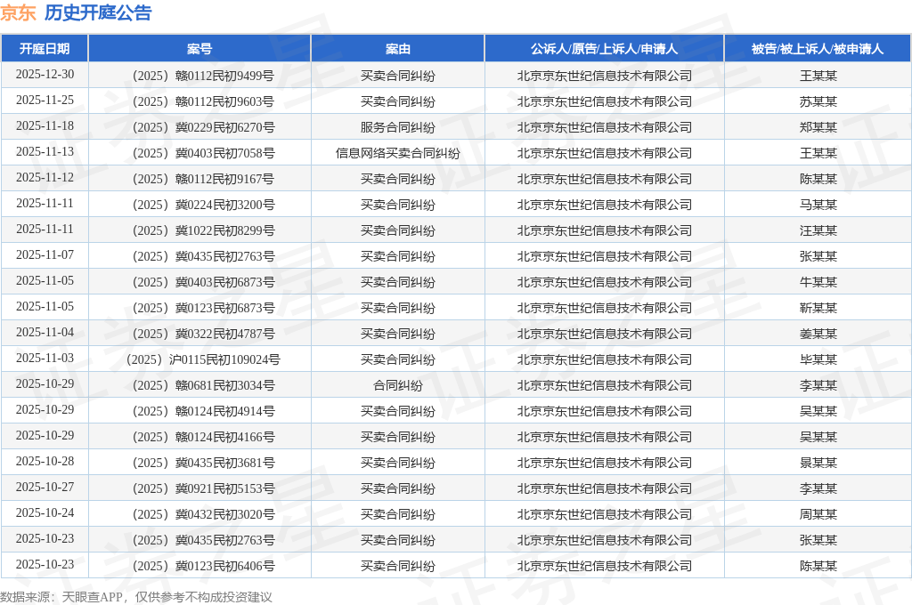 案号:(2025)赣0112民初7964号审理法院:南昌市新建区人民法院案由:合同纠纷当事人信息: 原告/上诉人:北京京东世纪信息技术有限公司 被告/被上诉人:梁某某开庭日期:2025年9月16日根据统计,近一年内以北京京东世纪信息技术有限公司为当事人的历史开庭公告有681则,其中案由为“买卖合同纠纷”的公告以466则居首,其次为“信息网络买卖合同纠纷”有99则,“分期付款买卖合同纠纷”有25则。历史开庭公告(前20条)如下: